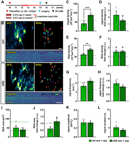 Cuprizone-induced alterations in OPC Ca2+ signaling are reduced after OPC-GABABR downregulation. (A) Experimental design for tamoxifen-induced GABABR downregulation and GCaMP3 expression in NG2+ OPCs, cuprizone treatment, spinal cord window implantation surgery, and in vivo two-photon laser-scanning microscopy (2P-LSM). (B) Representative maximum-intensity projections of the GCaMP3 signal (ΔF/F0) for representative FOVs over the entire recording time (up to 5 min), and associated maps of selected identified regions-of-activity (ROAs) with associated heatmap representation of the GCaMP3 signal profile over time. Scale bar, 20 µm; 30 s. (C) Signal density and (D) fold-change compared to untreated ctrl and cKD mice. (E) ROA density and (F) fold-change. (G) Per-ROA signal frequency and (H) fold-change. (I) ROA area and (J) fold-change. (K) Signal amplitude and (L) signal duration expressed as full width at half maximum (FWHM). Data are represented as mean ± SEM and are derived from N = 3–4 mice (n = 12 FOVs). In (C,E,G,I), data from untreated groups are overlapped as dotted lines (ctrl, light green; cKD, dark green). Data were analyzed using an unpaired t test. For each group in (D,F,H,J), data were tested using a one-sample t test to compare their mean with the hypothetical value μ = 1. In (D,F,H,J), the black dotted line corresponding to the non-treated ctrl and cKD (fold change = 1) is included as reference. # p < 0.05; ** p < 0.01 and *** p < 0.001.
