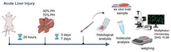 Ex vivo samples were obtained immediately after PH (0 day) or after isolation of the whole organ (on the 3rd and 7th day of regeneration). Initially, the liver was washed with saline. Immediately after obtaining the ex vivo sample, we performed studies using multiphoton microscopy, SHG, and FLIM. The time required for obtaining images did not exceed 30 min from the moment the ex vivo sample was collected.