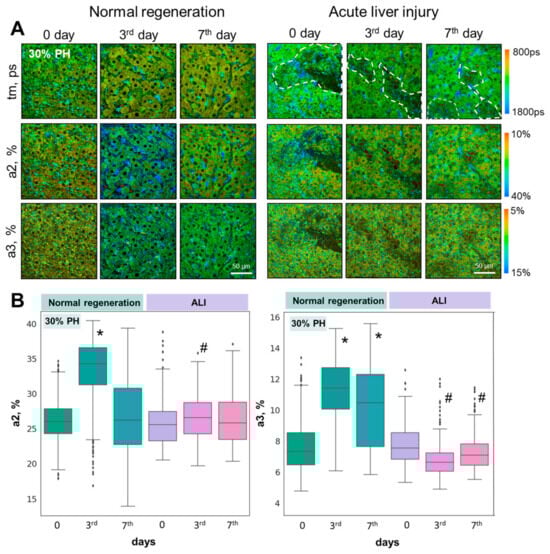 FLIM analysis of liver tissue with ALI during induced regeneration after 30% PH; (A) pseudo-coded FLIM images at different stages of liver regeneration in normal state and with ALI. (B) Boxplots reflecting the distribution of values of the fluorescence lifetime contributions of the bound forms of NADH and NADPH. Scale bar: 50 μm; ×400. *—statistically significant difference compared to normal liver (0 day). #—statistically significant differences compared to the corresponding time point for normal regeneration; p-value ≤ 0.05.