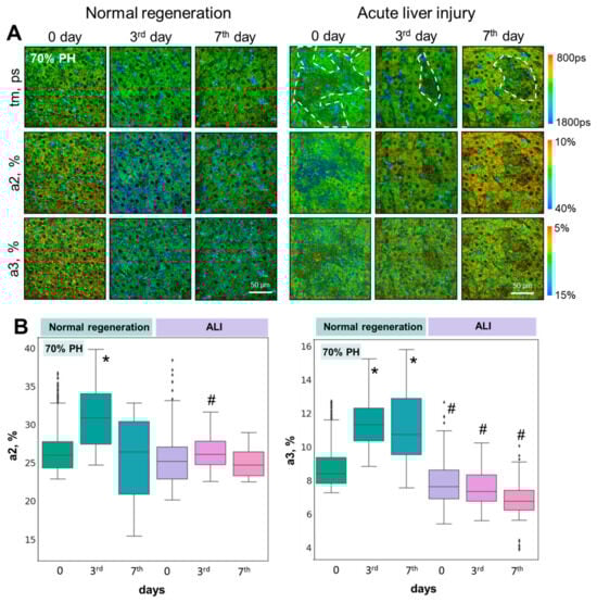 FLIM analysis of liver tissue with ALI during induced regeneration after 70% PH; (A) pseudo-coded FLIM images at different stages of liver regeneration in normal state and with ALI. (B) Boxplots reflecting the distribution of values of the fluorescence lifetime contributions of the bound forms of NADH and NADPH. Scale bar: 50 μm; ×400. *—statistically significant difference compared to normal liver (0 day). #—statistically significant differences compared to the corresponding time point for normal regeneration; p-value ≤ 0.05.