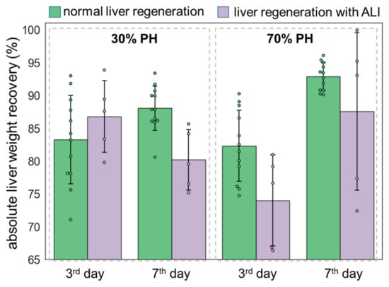 Analysis of liver weight recovery during regeneration in normal state and with induced ALI using 30% PH and 70% PH models. Each dot represents a measurement of the weight of one animal. Data are presented as mean ± standard deviation.