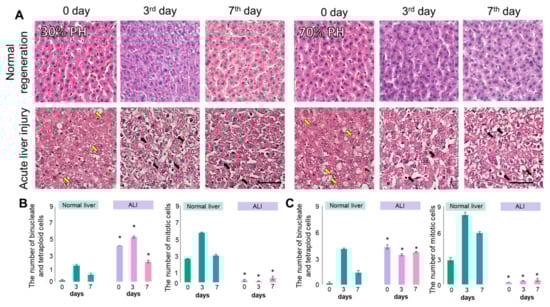 Histological (A) and morphometric analysis (B,C) of liver tissue with ALI during induced regeneration after 30% PH and 70% PH, hematoxylin and eosin; black arrows indicate balloon dystrophy of hepatocytes; yellow arrows indicate vacuolated hepatocytes. *—statistically significant differences compared to the corresponding time point for normal regeneration; p-value ≤ 0.05. Scale bar: 50 μm; ×400.