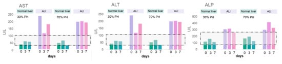 Biochemical blood tests confirmed cell damage during ALI (high values of AST, ALT, and ALP) at all stages of liver regeneration (Figure 7).