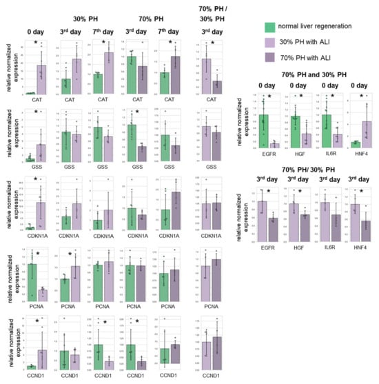 In the liver with ALI on day 0, the mRNA levels of the genes CAT (16.5-fold), GSS (4.5-fold), CDKN1A (14.4-fold), and UCP2 (3.5-fold) were significantly increased, indicating an induction of a response to oxidative stress []. Apparently, PH aggravates oxidative and endoplasmic reticulum (ER) stress during regeneration in the context of ALI and leads to insufficient compensatory processes, which are most pronounced in the 70% PH model.