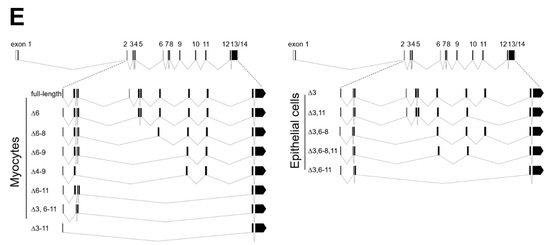 In 1998, Ohtsuka and colleagues discovered Nexilin as a cytosolic protein in various rat tissues. Additionally, two alternatively spliced variants were described: the so-called b-Nexilin is encoded by exon 1 to 13 but lacks exon 6 whereas s-Nexilin contains exon 6 but lacks exon 3. Despite the confirmation of single exons or parts of nexilin transcripts, no study to date has investigated the expression pattern of complete nexilin transcripts in human tissues. Moreover, the presence of the full-length transcript (encoded by 13 or 14 exons—depending on splicing events at the 3′ end; see below) has not been confirmed by PCR and sequencing approaches. To address this question, we analyzed myocyte samples from human heart and skeletal muscle as well as epithelial samples from human colon and urinary bladder. Primers were designed to target the start and stop regions of the translation to span full transcripts, which could potentially serve for different protein isoforms (ON979—fwd primer in exon 2 which contains the start codon; ON980—rev primer in exon 13—ON980, for localization of primers in human nexilin sequence see Appendix A, Figure A3). Subsequently, all PCR products were sequenced. The sequencing revealed several new nexilin splice variants with varying abundance across the tissues analyzed (Figure 1A).