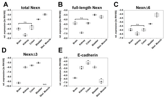 Quantification of nexilin transcripts in mouse tissues. Mouse RNA samples were subjected to qRT-PCR to analyze the expression of different nexilin transcripts in various organs. (A) To detect total Nexn, the primers were placed in exon 9 (fwd) and 10 (rev). (B) Forward primer in exon 3 and reverse primer in exon 6 enabled quantification of full-length Nexn. (C,D) Taqman probes spanning exon 5–7 boundary and 2–4 boundary were used to detect Nexn∆6 and Nexn∆3, respectively. (E) To quantify the epithelial cells in the analyzed tissues we used primers that target E-cadherin. The relative expression to RN18S (reference gene) is given as base 10 logarithm. For reasons of clarity, we have not plotted the significances in the graphs. There are significant differences (p < 0.001) between all groups except for total Nexn, full-length Nexn and Nexn∆6 between brain and colon; and for E-cadherin between kidney and bladder. ANOVA (repeated measures, on ranks, Holm–Sidak), n.s.: not significant, b.d.l.: below detection limit, n = 4.