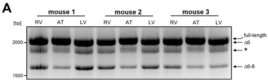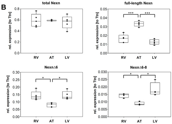 Based on sequencing results, two PCR products migrated as one band at ~2100 bp: Nexn full-length and Nexn∆6. The full-length variant appeared to be more prominent in the atria and/or Nexn∆6 more in the ventricles. In addition, the variant Nexn∆6–8 appeared to be higher expressed in ventricles compared to atria. The Nexn∆6–8 transcript favors the formation of an artificial PCR product that migrates with a slightly higher molecular weight (Figure 3A, *). The sequence of this product was identical to the sequence of Nexn∆6–8 but migrated at a different molecular weight. Formation of this artificial product could be prevented by reducing the cooling speed after completion of the PCR (Appendix A, Figure A2). To quantify the individual transcripts, we performed qRT-PCR. Primers, which target exon 9 and 10 (ON1707, ON1765), and thus do not discriminate between the majority of the transcripts, were used to detect total nexilin. Here, we observed no differences between atria and ventricles (Figure 4B, total Nexn). Expression of full-length Nexn (ON1705, ON1829) was higher in the atria compared to ventricles. In contrast, Nexn∆6 (ON2059, ON2060, P1) and Nexn∆6–8 (ON2061, ON2063, P3) showed higher expression in the ventricles compared to atria. Titin (Ttn, ON1999, ON2000) served as reference to correct for the myocardium.