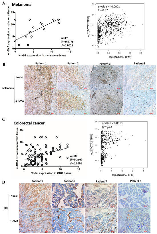 Correlation of α-smooth muscle actin (α-SMA) and Nodal expression in human melanoma and colorectal cancer (CRC) tissues. (A) The levels of α-SMA and Nodal expression in human melanoma were detected by immunohistochemistry (IHC) and evaluated (left). Correlation between α-SMA and Nodal mRNA expression in melanoma cancer tissues from the Cancer Genome Atlas Program (TCGA database; right). (B) Representative immunohistochemical images of α-SMA and Nodal expression in human melanoma tissues. (C) The levels of α-SMA and Nodal expression in human CRC were detected by IHC and evaluated (left). Correlation between α-SMA and Nodal mRNA expression in CRC tissues from TCGA database (right). (D) Representative immunohistochemical images of α-SMA and Nodal expression in human CRC tissues.