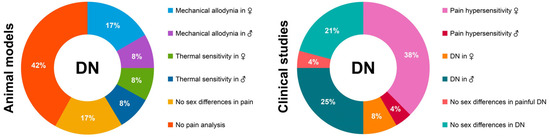 The inherent variability of the animal models and the still limited number of preclinical studies comparing sexes may be a reasonable cause that affects the robustness of current available data in the literature. More efforts should be made to improve and refine the analysis of sensory alteration induced by DN across sexes both at the laboratory bench and the bedside level.