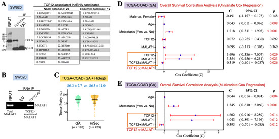TCF12 cooperates with MALAT1 to exacerbate CRC prognosis. (A) Identification of MALAT1 as a TCF12-associated lncRNA by RNA immunoprecipitation (IP) and sequencing. After immunoblot analysis to confirm that TCF12 was specifically immunoprecipitated by the anti-TCF12 antibody from the lysate of SW620 cells, the anti-TCF12 immunoprecipitates were further subjected to the procedures of RNA extraction and next-generation sequencing. Several TCF12-associated lncRNAs were annotated after the sequence alignment analyses with NCBI and Ensembl databases. (B) Validation of MALAT1 as a TCF12-associated lncRNA. MALAT1 was detected by RT-PCR from the RNA sample isolated from the anti-TCF12 immunoprecipitates of SW620 cells. (C) ESTIMATE algorithm was used to estimate the tumor purities of the CRC specimens employed by the GA and HiSeq platforms of the TCGA-COAD dataset. (D) Univariate Cox regression analyses showing that age, metastasis, and expression levels of TCF12 mRNA and MALAT1 under an alliance but not alone were significantly associated with patients’ shorter overall survival outcomes. The interaction term of TCF12 mRNA and MALAT1 expression levels, designated as “TCF12 × MALAT1”, was represented as three covariates in a multivariate Cox regression analysis: TCF12 mRNA expression level (designated as “TCF12”), MALAT1 expression level (designated as “MALAT1”), and the multiplication of TCF12 mRNA and MALAT1 expression levels (designated as “TCF12 ⦁ MALAT1”). (E) Multivariate Cox regression analysis showing that the association of the TCF12–MALAT1 alliance with CRC poorer prognosis remained statistically significant after adjusting for patients’ age and tumor metastasis.