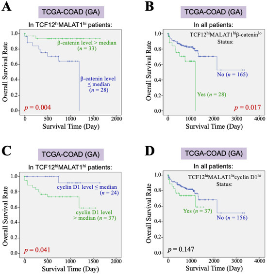 β-catenin and cyclin D1 gene expression affect the association of the TCF12–MALAT1 alliance with CRC patients’ poorer survival outcomes. (A) Kaplan–Meier OS curves of the 61 TCGA-COAD (GA) TCF12hiMALAT1hi patients who were divided into two groups based on the β-catenin mRNA expression level > or ≤ median. Low β-catenin mRNA expression was significantly associated with shorter OS in the TCF12hiMALAT1hi patients (p = 0.004 by the log-rank test). (B) Kaplan–Meier OS curves of the 193 TCGA-COAD (GA) patients who were divided into two groups based on the patients with or without the status of higher TCF12 mRNA expression, higher MALAT1 expression, but low β-catenin mRNA expression (designated as “TCF12hiMALAT1hiβ-cateninlo”). The patients with the TCF12hiMALAT1hiβ-cateninlo expression status significantly exhibited a poorer prognosis when compared with other patients (p = 0.017 by the log-rank test). (C) Kaplan–Meier OS curves of the 61 TCGA-COAD (GA) TCF12hiMALAT1hi patients who were divided into two groups based on the cyclin D1 mRNA expression level > or ≤ median. The patients with high cyclin D1 mRNA expression had a worse OS rate (p = 0.041 by the log-rank test). (D) Kaplan–Meier OS curves of the 193 TCGA-COAD (GA) patients who were divided into two groups based on the patients with or without the status of higher TCF12 mRNA expression, MALAT1 expression, and cyclin D1 mRNA expression (designated as “TCF12hiMALAT1hicyclin D1hi”). The patients’ OS between the two groups showed no significant difference.