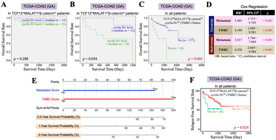 Furthermore, we investigated the impact of the β-catenin and cyclin D1 gene expression levels on the overall survival of CRC patients with TCF12hiMALAT1hi status. First, among the 193 patients in the TCGA-COAD (GA) dataset, 61 patients exhibited a TCF12hiMALAT1hi expression status. When these patients were further divided into two groups based on whether their β-catenin mRNA levels were greater than the median, we found that patients with higher β-catenin mRNA expression had a better prognosis than those with a lower expression (p = 0.004, Figure 3A). Among the 193 patients, only 28 had the TCF12hiMALAT1hiβ-cateninlo expression status and showed a statistically significant poorer prognosis (p = 0.017, Figure 3B), but the Chi-square analysis showed no difference in tumor recurrence and metastasis (p = 0.728 and 0.918, respectively). When the 61 patients with the TCF12hiMALAT1hi expression status were divided into two groups based on whether their cyclin D1 mRNA levels were greater than the median, we found that patients with higher cyclin D1 mRNA expression had poorer prognosis compared to those with lower expression (p = 0.041, Figure 3C). Among all 193 patients, 37 had the TCF12hiMALAT1hicyclin D1hi expression status, which was significantly associated with patients’ tumor recurrence (p = 0.018) but not metastasis (p = 0.515). Their poorer prognosis did not reach statistical significance (p = 0.147, Figure 3D). Next, we evaluated the combined effects of β-catenin and cyclin D1 gene expression levels on the OS of CRC patients with the TCF12hiMALAT1hi status. As shown in Figure 4A, in the TCGA-COAD (GA) dataset, there were 33 patients whose tumor tissues simultaneously expressed higher levels of TCF12 mRNA, MALAT1, and β-catenin mRNA. These patients showed no significant difference in OS regardless of whether their cyclin D1 mRNA expression levels were greater than the median (p = 0.288). In the TCGA-COAD (GA) dataset, 28 patients exhibited higher TCF12 and MALAT1 gene expression levels but lower β-catenin gene expression (i.e., the TCF12hiMALAT1hiβ-cateninlo expression status). Among these patients, those with higher cyclin D1 gene expression levels had a noticeably poorer OS, although the difference did not reach statistical significance due to the small sample size (p = 0.054, Figure 4B). We further defined the patients with a TCF12hiMALAT1hiβ-cateninlocyclin D1hi expression status as having the TMBC pattern. Among the 193 patients, 16 patients exhibited the TMBC pattern, and they had significantly worse OS compared to those without the TMBC pattern (p < 0.001, Figure 4C). Since tumor metastasis is a key factor leading to mortality in CRC patients, we validated the association between TMBC pattern and poorer OS in non-metastatic and metastatic patients, respectively. The results revealed that the patients with the TMBC pattern exhibited worse OS outcomes regardless of their metastasis status (Supplemental Figure S3). Therefore, we further performed univariate Cox regression analyses to assess the impact of both the TMBC pattern and metastasis on OS. The results showed that both the TMBC pattern and metastasis were statistically significant risk factors for poorer OS in CRC patients (Figure 4D). Furthermore, a multivariate Cox regression analysis demonstrated that the TMBC pattern and metastasis were both statistically significant independent risk factors for poorer OS (Figure 4D). The hazard ratio (HR) of the TMBC pattern was even higher than that of metastasis (4.476 vs. 3.517). The nomogram shows that when the TMBC pattern had a prognostic score of 100, tumor metastasis exhibited a relative score of 84 (Figure 4E), suggesting that the TMBC pattern is a metastasis-independent and even stronger prognostic factor for poorer OS in CRC patients. Patients with the TMBC pattern could be predicted to have a one-year survival rate of 60%, but their three-year survival rate dropped to only 30%. These TMBC patients exhibited a worse prognosis regardless of metastasis. We wondered if tumor recurrence could be a primary risk factor contributing to the mortality of this group of patients. As shown in Figure 4F, these TMBC patients indeed had a significantly shorter RFS, suggesting that early tumor recurrence could be a mortality risk for these patients.