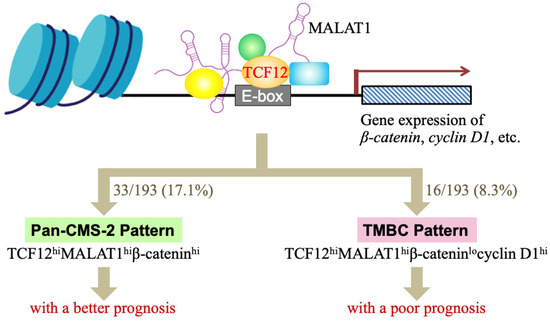 A schematic illustration summarizing our studies of whether the TCF12–MALAT1 alliance and its downstream β-catenin and cyclin D1 determine a good or poor CRC prognosis. TCF12 is a transcriptional factor involved in numerous cellular processes. MALAT1 is a long lncRNA that can form a complex with TCF12, creating an alliance with correlated expression levels in CRC patients. This TCF12–MALAT1 alliance is linked to poorer prognosis independently of age and metastasis status. To identify the downstream factors/events responsible for this outcome, we analyzed 2312 common target genes of TCF12 and MALAT1 through MGSA pathway enrichment analysis, finding involvement in pathways like Aurora B, ATM, PLK1, and non-canonical WNT. We further investigated the impact of WNT downstream genes β-catenin and cyclin D1 on survival in CRC patients with the TCF12–MALAT1 alliance. Our analysis of the TCGA-COAD (GA) dataset revealed that 61 out of 193 patients had tumors with the “TCF12hiMALAT1hi” expression status. Furthermore, 33 out of 61 patients had higher β-catenin mRNA levels in tumors. They were classified as having a “Pan-CMS-2 pattern” and exhibited better survival outcomes. For the other 28 patients with low expression levels of β-catenin mRNA in tumors, 16 out of them expressed higher levels of cyclin D1 mRNA in tumors, i.e., the “TCF12hiMALAT1hiβ-cateninlocyclin D1hi” expression status or the so-called “TMBC pattern”. They exhibited poorer RFS and OS outcomes independently of metastasis. Early tumor recurrence seemed to be a mortality risk to these TMBC patients.