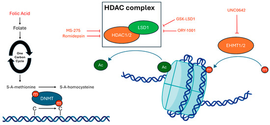 Schematic representation of epigenetic modifications targeted by therapeutic interventions in murine models for ASD. Abbreviations: HDAC complex: histone deacetylase complex, HDAC1/2: histone deacetylase 1 and 2, LSD1: lysine-specific demethylase 1A; EHMT1/2: eurochromatic histone-lysine methyltransferase 1 and 2; DNMT: DNA methyltransferase, m: methyl group; Ac: acetyl group.