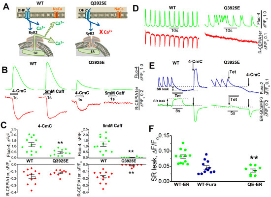 Calcium signaling from WT and Q3925E hiPSC-CMs. (A) The diagram shows that RyR2 Ca2+-binding residues mutation cause defective CICR. (B) Application of 5 mM 4-CmC and 5 mM caffeine triggered ER Ca2+ release and cytosolic Ca2+ signal measured by R-CEPIA1er and Fluo-4 simultaneously. (C) Quantification of 4-CmC and caffeine-triggered Ca2+ signals measured by Fluo-4 and R-CEPIA1er simultaneously. n = 12 for WT and n = 10 for Q3925E cells. ** p < 0.01 vs. WT by unpaired t-test. (D) Spontaneous cytosolic Ca2+ transients and SR Ca2+ release measured by Fluo-4 and R-CEPIA1er in WT and Q3925E cells. (E) SR Ca2+ leak measured with Fura-2 and ER-GCamP6 probe in WT and Q3925E mutant cells. (F) Quantification of SR Ca2+ leak measured by ER-GCamMP6 and Fura-2 in WT cells and SR Ca2+ leak measured by ER-GCamMP6 in Q3925E cells. ** p < 0.01 vs. WT by unpaired t-test.
