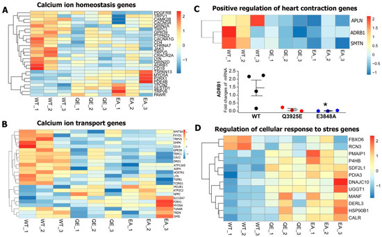 Heatmap of RNA sequencing results from WT and Ca2+ binding site mutant Q3925E and E3848A hiPSC-CMs. (A) GO: 0055074. Calcium homeostasis genes. (B) GO:0006816. Calcium ion transport genes. (C) GO: 0045823. Positive regulation of heart contraction genes. Lower panel: quantification of ADRB1 transcription levels in WT and the two mutant hiPSC-CMs by quantitative RT-PCR. * p < 0.05 vs. WT by one-way ANOVA. (D) GO: 0080135. Regulation of cellular response to stress genes. The lines on the left of the heatmaps are a simple dendrogram, which attempts to find trends within the data and cluster them together.