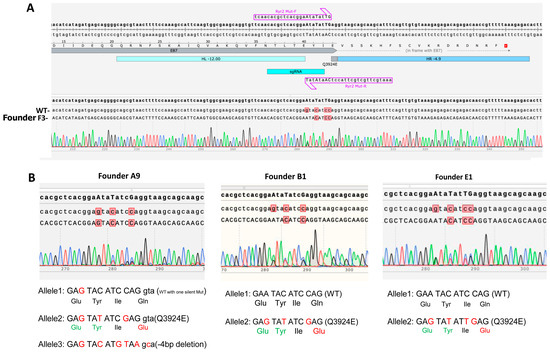 Since Q3925E-RyR2 mutation causes marked Ca2+ signaling aberrancies in hiPSC-CMs, suggesting the possible remodeling of calcium signaling pathways, we sought to create a mouse model of this mutation to further explore its whole animal pathology. Using the CRISPR/Cas9 technique, we introduced the RyR2-Q3924E mutation (equivalent to Q3925E in humans) in mouse embryos with the technical assistance of the MUSC Transgenic Core facility. Figure 3A shows the design to introduce the Q3924E mutation (CAG to GAG) and two silent mutations (TAC to TAT and GAG to GAA) in RYR2 exon 87. Genomic DNA was collected from the mice toe tissue, and the gene-edited locus was amplified by PCR. The mutations were screened by the mutant primers (Figure 3A) and then confirmed by the sequencing of the WT PCR product, in which the primer binding sites were outside of the homologous arms. We obtained three male heterozygous mice and one male chimera (mosaic) mouse harboring the Q3924E mutation. Figure 3 shows the sequencing results of the four mice. Heterozygous founders B1, E1 and F3 all showed the desired mutation in one of their alleles, carrying 50% of the Q3924E mutation. The mosaic mouse founder A9 carried only 25% of the Q3824E mutation. Surprisingly, all the heterozygous and chimera mice died before we could establish the germline transmission of the mutation in their offspring. A postmortem examination of the hearts, nevertheless, showed that the hearts of the chimera mice were significantly larger than those of the wild-type mice (160 mg vs. 105 mg).