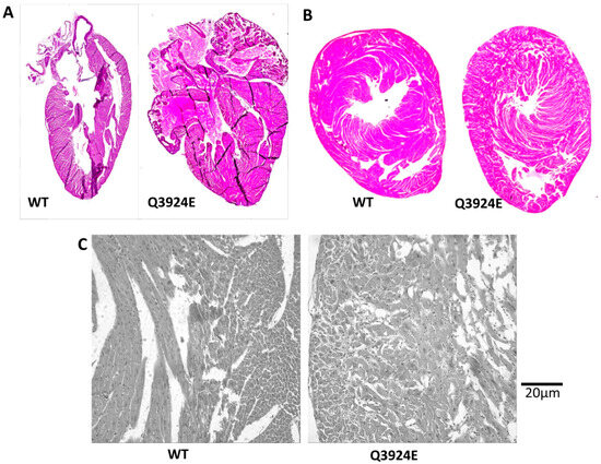 The heart of the A9 founder mouse was fixed and longitudinally sectioned. Cross-section samples were obtained from the E1 founder mouse heart. H&E-stained longitudinal heart sections from the WT and founder A9 chimera mice showed significant cardiac hypertrophy in the Q3924E mutants compared to the WT mice, as shown in Figure 4A. Figure 4B also compares WT vs. founder F3 (heterozygous) mouse heart cross-sections, showing a thicker left ventricular wall and a much smaller ventricular chamber in the Q3924E mice. The imaged cardiomyocytes also appeared to be larger and somewhat disorganized, as shown in Figure 4C. Although we have thus far examined only a few hearts, the data obtained suggest that the Q3924E-RyR2 mutation causes significant cardiomyopathy, which is lethal to mice.