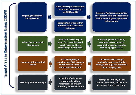 Cellular senescence, where cells lose their ability to divide and adopt a pro-inflammatory state, is a major contributor to tissue aging. By using CRISPR to silence genes associated with senescence or to upregulate genes that enhance cellular resilience, researchers can reduce the number of senescent cells and promote tissue health [91]. For example, silencing the p16INK4a or p53 pathways, which are involved in the onset of cellular senescence, could help delay or reverse aging effects in targeted tissues [92,93]. However, it must be noted that the use of gene-editing technology like CRISPR and the production and distribution of personalized stem cell treatments are inherently expensive processes that require specialized facilities and expertise. Figure 1 shows a refined structure that highlights each rejuvenation target, specific gene-editing interventions, and the direct benefits to cellular health and aging.
