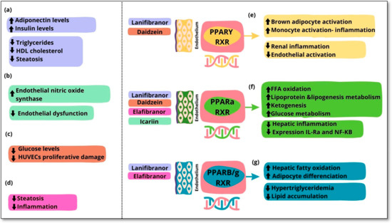 Biological effects of PPAR isotype agonists related to endothelial dysfunction. Several PPAR agonists are used as pharmacological targets. The main biological actions of lanifibranor are the improvement in triglycerides, HDL cholesterol levels, and steatosis in addition to the increase in adiponectin and insulin levels (a). Icariin, a PPARα agonist, promotes endothelial nitric oxide synthase and improves endothelial dysfunction (b). Daidzein, a PPARα and PPARγ agonist, contributes to reducing high glucose levels and ameliorating proliferative damage in human umbilical vein endothelial cells (HUVECs) (c). Elafibranor, a PPARα and PPARβ/δ agonist, improves steatosis and inflammation (d). The biological effects of PPAR isotypes are as follows: PPARγ is responsible for the activation of brown adipose tissue and monocytes in response to inflammation, contrary to the prevention of renal inflammation and endothelial activation (e). PPARα is principally involved in various liver functions, such as the promotion of free fatty acid oxidation, lipogenesis, and glucose metabolism, but it decreases inflammation and the expression of IL-1 receptor agonists (IL-Ra) and nuclear factor kappa B (NF-kB) (f). PPARβ/δ promotes the increase in hepatic fatty acid oxidation and adipocyte differentiation while reducing hypertriglyceridemia and lipid accumulation (g).