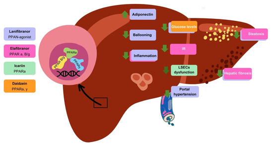 Effect of PPAR agonists on MASLD pathology. Through PPAR agonist drugs, there are different beneficial actions at the liver level for MASLD pathology. Lanifibranor, a PPAR agonist, reduces glucose levels and steatosis and improves portal hypertension and fibrosis; additionally, it increases adiponectin levels, which reduce hepatocyte ballooning and, consequently, inflammation. Elafibranor is a PPAR α-β/δ agonist that decreases inflammation and insulin resistance (IR), which synchronously slows down steatosis and fibrosis progression. Icariin, a PPARα agonist, reduces endothelial dysfunction thereby affecting liver sinusoidal endothelial cells (LSECs). Finally, Daidzein, a PPARα,γ agonist, promotes decreased levels of glucose.