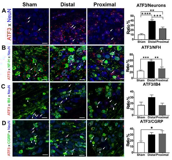 The characterization of ATF3-positive DRG neurons. The ratios of (A) total ATF3, (B) ATF3/NFH, (C) ATF3/IB4, or (D) ATF3/CGRP colocalized DRG neurons of animals with distal nerve constriction (Distal), proximal nerve constriction (Proximal), or sham operation (Sham). Data are mean ± SEM, N = 6 rats in each group. * p < 0.05, ** p < 0.01, *** p < 0.001, **** p < 0.0001, scale bar = 50 μm. Arrows indicate the ATF3 expression, arrowheads indicate a neuron subtype marker (NFH, IB4, or CGRP).
