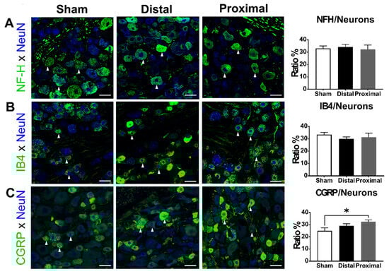 The subpopulation of DRG neurons 1 day after the operation. The ratios of (A) NFH, (B) IB4, or (C) CGRP-positive (arrowheads) DRG neurons of animals with distal nerve constriction (Distal), proximal nerve constriction (Proximal), or sham operation (Sham). Data are mean ± SEM, N = 6 in each group. * p < 0.05, scale bar = 50 μm.