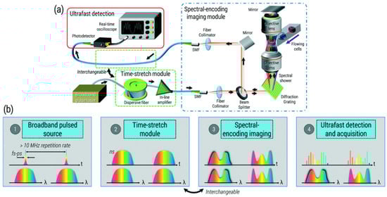 Optical time-stretch (OTS) microscopy. (a) Overall schematic of the optical setup. (b) The change in temporal and spectral components of optical pulses as they go through each module in (a). The original femtosecond pulse is stretched temporally using chromatic dispersion through a long fiber. Then, each spectral component is mapped to a different spatial position on the channel where the cells flow, and the light attenuation at each spatial position is encoded onto the spectrum, which also corresponds to the temporal pulse shape. In the end, an ultrafast detector captures the temporal pulse shape, which represents the spatial profile at the cross-section of the channel. Reproduced with the permission of the Royal Society of Chemistry from [].