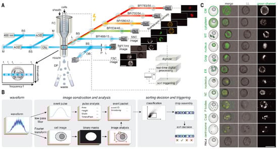 Cell sorter with fluorescence imaging using radiofrequency-tagged emission (FIRE). (A) Schematic of FIRE and cell sorting. Different frequency component-modulated beams are directed to different horizontal positions of cell. Resulting fluorescence will also have corresponding modulation and this can be decoded by signal processing. (B) Real-time signal processing, image analysis, and evaluation for cell sorting. (C) Example cell images of different organelles obtained with FIRE. Scale bar, 20 µm. From []. Reprinted with permission from AAAS.