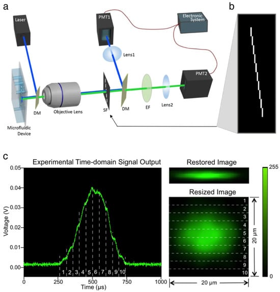 Another single-pixel fluorescence imaging technique for IFC is a spatial–temporal transformation method developed by Han and Lo []. This uses a simple optical setup for converting the spatial information of the cell to the temporal information of the fluorescence signal with an optofluidic approach (Figure 4a). A spatial filter with a pattern as in Figure 4b is used in the detection path to detect the fluorescence signal from a column of pixels one by one as the cell flows through, and by stacking the temporal signal from each column, a fluorescence image of the cell can be obtained (Figure 4c). Using this, imaging of cells at 0.2 m/s was achieved. Although this system may not be as fast as the previously mentioned technologies, it is highly versatile because of its simplicity, and can be expanded to bright-field imaging [], 3D imaging [], and hyperspectral imaging []. Furthermore, it is also compatible with image-activated cell sorting [].