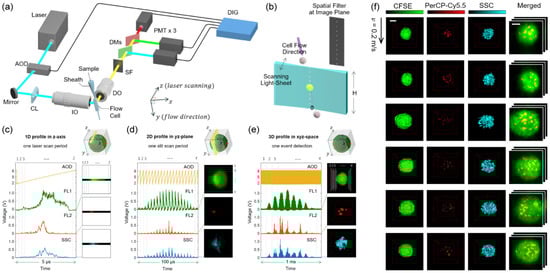 The first successful implementation of 3D IFC at high throughput and with subcellular resolution was the 3D extension of the spatial–temporal transformation by Han and Lo (Figure 6) []. This camera-less 3D IFC uses a similar spatial filter in the detection path as the 2D spatial–temporal transformation but changes the excitation beam so that it is scanned in the depth direction (Figure 6b). The excitation beam is scanned at high speed using an acousto-optic deflector (AOD) so that, for each pixel of its 2D counterpart, the whole depth axis is scanned (Figure 6c). Then, in a similar scheme as the 2D version, the other two dimensions are acquired to obtain a 3D volume of a cell (Figure 6d,e). This enabled 3D IFC at a flow velocity of 0.2 m/s, similar to its 2D counterpart, while achieving spatial resolution of about 2 µm, and demonstrated that the amount of DNA damage inside the cell can be quantified, which would be difficult with 2D IFC because of occlusions of fluorescence spots []. This 3D IFC can be combined with 3D convolutional neural networks to classify cells at higher accuracy than what is possible with 2D IFC [].