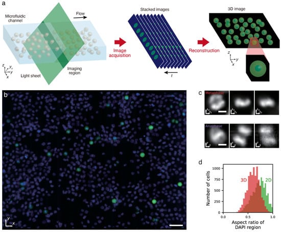 Such high-throughput 3D IFC achieves what was difficult with 2D IFC or 3D microscopy. For example, detecting morphological differences in organelles of small subpopulations requires large populational screening to capture a sufficient quantity of the cells in the subpopulation and, at the same time, requires 3D imaging to recognize the difference accurately. In particular, detection of mitotic abnormalities involves the chromosome being visualized in mitotic cells, which only exists in a fractional amount [,]. As seen in Figure 7c, parallel 3D IFC can identify the chromosomal structure of mitotic cells, which would be overlooked by only 2D imaging []. Furthermore, its scalability allows for capturing more than 10,000 cells in mitosis (Figure 7d), potentially leading to the future development of machine-learning models for detecting atypical mitotic figures.