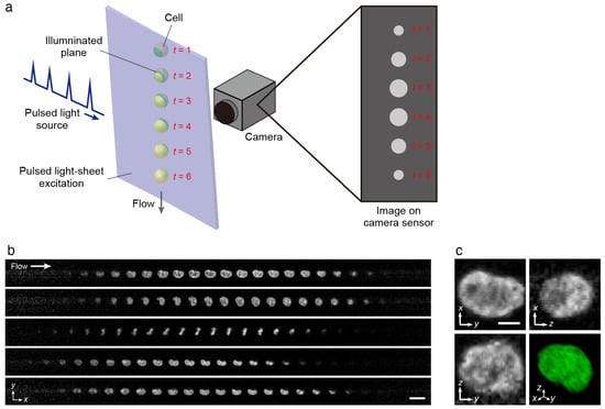 In contrast to parallel 3D IFC, a technology called optofluidic light-sheet imaging with transformation of spatial information (FLITS) enables 3D imaging of cells flowing one by one at high speeds []. This technology uses a stroboscopic light-sheet illumination that is placed slightly at an angle to the channel flow direction so that when a cell flows through this region, each cross-section of the cell will be illuminated with each pulse of the stroboscopic illumination (Figure 8a). Then, a single exposure of a camera collects all these cross-sections to produce a 3D image of the whole cell. As a result, FLITS can image cells at a flow velocity of over 10 m/s (Figure 8b,c), which is the fastest 3D IFC comparable to the fastest 2D fluorescence IFC in terms of flow velocity, and this speed is only limited by the fluorescence lifetime of the fluorophore. It has been demonstrated that even at this velocity, blur-free images of subcellular structures can be obtained with sub-micrometer isotropic resolution.
