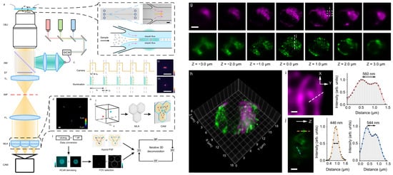 Light-field flow cytometry. (a–f) Overall schematic. The image created at the native image plane (NIP) is relayed to the camera while having a microlens array (MLA) before the camera instead of a lens (a). Because each microlens in the array creates on the camera an image of the cell from different view angles, a 3D image can be computationally reconstructed from those views. (g–j) 3D reconstructed images of mitochondria (magenta) and peroxisome (green) of HeLa cells. (g) Reconstructed images of different planes. Scale bar, 5 µm. (h) Merged 3D image. (i,j) Zoomed-in images. Scale bars, 500 nm. Adapted from [].