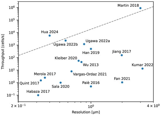 Comparison of 3D IFC technologies [,,,,,,,,,,,,,,,]. Dashed line shows the theoretical limit with current sCMOS cameras. Martin, 2018 [] uses a linear PMT array and is able to surpass this limit. Hua, 2024 [] does not estimate the throughput based on the frame rate of the camera and therefore exceeds this limit. Plotted values are based on the best reported throughput and resolution in the dimension that has the smallest value if provided or an estimate based on the reported measurement parameters. Ugawa, 2022a and Ugawa, 2022b correspond to references [] and [], respectively.