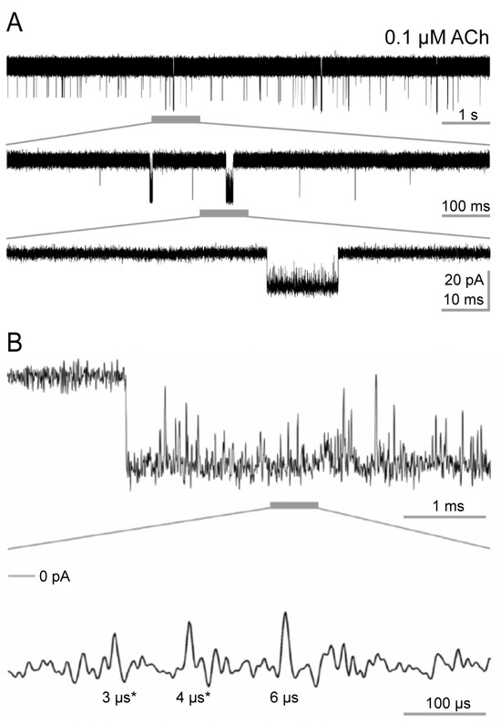 - Hallermann, S.; Heckmann, S.; Dudel, J.; Heckmann, M. Short openings in high resolution single channel recordings of mouse nicotinic receptors. J. Physiol. 2005, 563, 645–662. [Google Scholar] [CrossRef] [PubMed]