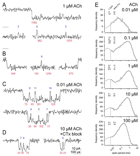 Original records of bursts with ACh at 60 kHz temporal resolution and open period distributions. Below and above the current traces, open times (red) and shut times (blue, both in µs) characterize openings and closings in the adjacent current trace. The respective numerical values were gained in evaluations of open and closed times, like in Figure 3 at 40 kHz. All current traces have the same calibration of amplitude and time. (A) Three sections of a 14.79 ms long burst of openings elicited by a bi-liganded receptor (with 1 µM ACh), showing its initial 1382 µs long opening, which is terminated by a 5 µs long gap which is shown on the left in the middle panel. The horizontal straight line on the left in this panel indicates the closed level at 0 pA. The third section towards the end of this burst shows an 8 µs long gap before a 362 µs long opening, another 5 µs long gap, and then a 1270 µs long opening in the right panel, which terminates this long burst in the lowest panel. (B) Three sections of a 7.04 ms burst of openings from the same recording. The segment on the left shows the start of the first opening, the middle segment shows the longest gap in this burst, and the third segment on the right shows the end of the final opening in this burst. (C) Examples of short mono-liganded bursts elicited by 0.01 µM ACh. (D) Mono-liganded bursts with 10 µM ACh while the Rαδ receptor site is blocked by α-Conotoxin-M1. (E) Probability density functions fitted to open period distributions from recordings with 0.01 to 100 µM ACh. ACh concentration increases from top to bottom, as indicated on the right. Ordinates give the number of events per bin and the axis of abscissae event durations on a log scale. Distributions of open periods were fitted by 2–4 component probability density functions (see Section 2.5). The parameters τ and areas of each fit are given in the upper left of each plot. Very short and long openings appear at 0.01 µM ACh and higher concentrations. Corresponding distributions of shut times are shown in Figure S1.