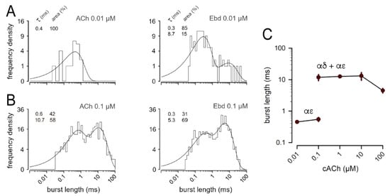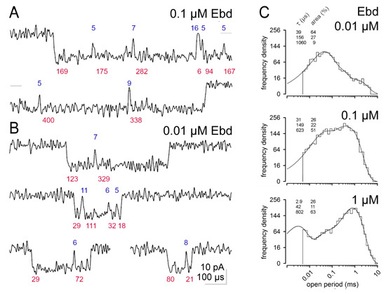 Similar to Figure 2, we show examples of original recordings with the agonist epibatidine (Ebd) in Figure 3 [12,29]. Compared to Figure 2A, the bi-liganded burst in Figure 3A presents a much higher rate of closures. Mean values for open times with Ebd are given in Table 1. The mono-liganded bursts of openings in Figure 3B are not different from those in Figure 2B, except that they appear shorter. Like Figure 2, the open periods for Ebd are shown in Figure 3C, and the corresponding shut time distributions are shown in Figure S2. Ebd has a slightly higher affinity to the receptors than ACh. In contrast to ACh, it gives rise to a significant number of long openings (τo4), which stem from bi-liganded nAChRs already at 0.01 µM (regarding affinity, see also Figure 2 in [12]. The 39 and 156 µs opening components with 0.01 µM Ebd are equivalents of τo2 and τo3 seen with ACh. At all concentrations of Ebd in Figure S2, a very short shut time is prominent. With 0.1 µM Ebd, three types of openings appear again, but now the long component (τo4) is dominant (Figure 3C). Unlike that of the same ACh concentration, the very short open period (τo1) is not resolved. At 1 µM Ebd, very short open periods are present (like with ACh), but again, like with ACh, τo3 is unresolved. Interestingly, µBs occur less often at higher agonist concentrations and are much less frequent in bi-liganded than mono-liganded bursts. This appears to be the case for both Ebd and ACh.
