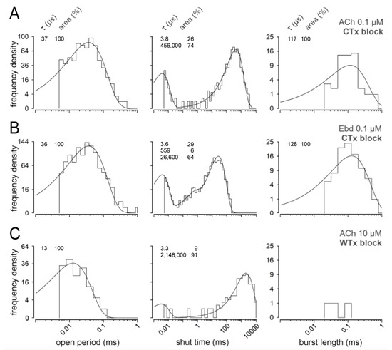 Waglerin-1 (WTx) is a snake venom that blocks neuromuscular transmission in mammals [14,15,16] preferentially at the αε-site of nAChRs. The data for a cell incubated with 1 µM WTx are shown in Figure 5C. The shut time plot indicates that openings are infrequent; on average, less than one occurred during one second. Furthermore, only very short openings occurred with a mean duration of 13 µs. Almost all openings were singles, but occasionally, bursts occurred, as illustrated in the right panel of Figure 5C.