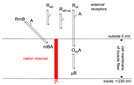 Scheme of the AChR molecule exposed to the agonist ACh. The receptor (R) binds the agonist (A) at its ligand binding site (Rαε). This elicits a conformational change that reaches the receptor’s central channel, initiating openings (OαεA) that can be followed by microsecond-long channel blocks (µB). An additional blocking mechanism named mB is also elicited by ACh binding. This occurs at higher concentrations, blocks channel openings completely, lasts several milliseconds, and is responsible for the open channel block or desensitization mechanisms.