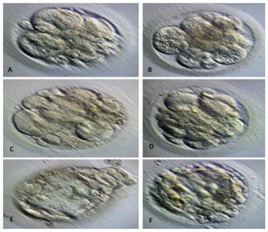 Until day 6, spent culture fluid was collected from non-degenerating embryos that were followed up at the blastomere level or at the arrest level in the first stage of blastocyst development, where degeneration started. (A–D): day 3 embryo whose blastomeres continue to be counted, fragmentation is observed and regeneration begins. (E,F): arrested day 5 embryo in which the blastocoel cavity is beginning to form, the trophoectoderm structure and (ICM) structure are not clearly visible and degeneration has begun.