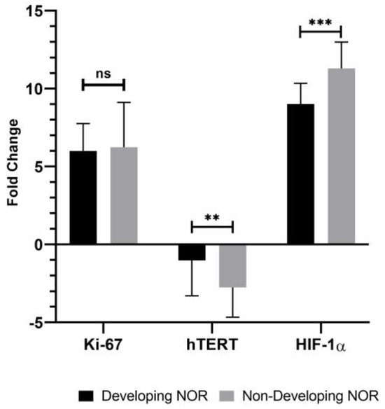 The fold change of Ki-67 (p > 0.05), hTERT (p < 0.05), and HIF-1α (p < 0.001) gene expressions which were determined in developing and non-developing embryo spent culture medium from normoresponder (NOR) patients (ns indicates p > 0.05 as non-significance; ** indicates p < 0.05; and *** indicates p < 0.001).