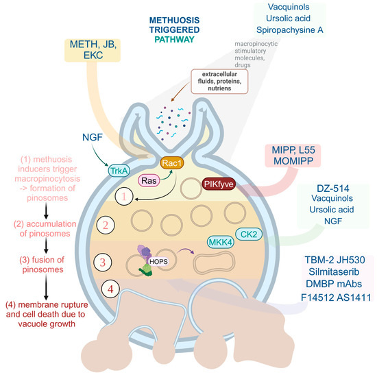 Macropinocytosis is a starting point of methuosis. It is an actin-driven mechanism that is activated by a variety of stimuli. It begins with plasma membrane ruffling and the creation of a pinocytotic cup, which envelopes extracellular fluid and produces a pinosome by membrane merger at the tip of a lamellipodium-like formation. The developing pinosome absorbs ions, nutrients, metabolites, toxins, pharmaceuticals, and even pathogens like viruses and bacteria, suspended in extracellular fluid. Physiologically, pinosomes migrate centripetally. Their acidity increases, their diameter shrinks, and they become tubulated, which is required for sorting and distributing the vesicles and their content [10]. This mechanism is significantly disrupted in methuosis, in which the cells “drink themselves to death”. Fluid intake is increased by macropinocytosis, and instead of shrinking, the vesicles enlarge, do not acidify, stay non-functional, and do not merge with lysosomes, but rather with each other. As a consequence of the creation of immense vacuoles and fatal cell expansion, plasma membrane rupture and cell destruction follow [10,24].