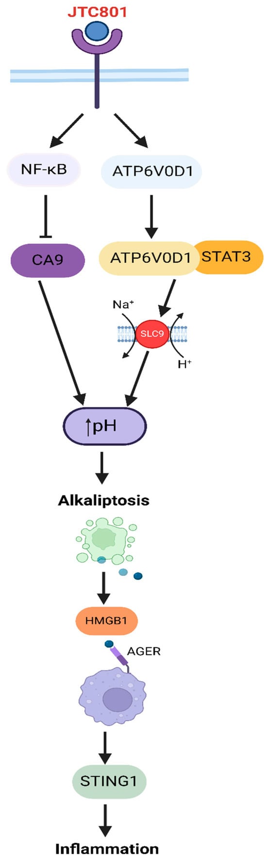 Schematic summary of alkaliptosis pathway induced by JTC801, a pH-dependent form of cell death. Upon binding to its receptor, JTC801 activates two distinct signaling branches. (1) JTC801 activates the NF-κB pathway, which subsequently upregulates carbonic anhydrase 9 (CA9). CA9 plays a role in maintaining cellular pH by modulating the acid–base balance. (2) JTC801 activates ATP6V0D1 and STAT3. ATP6V0D1 contributes to the alkalinization of the intracellular environment, further promoting the increase in cellular pH [11,43,44].
