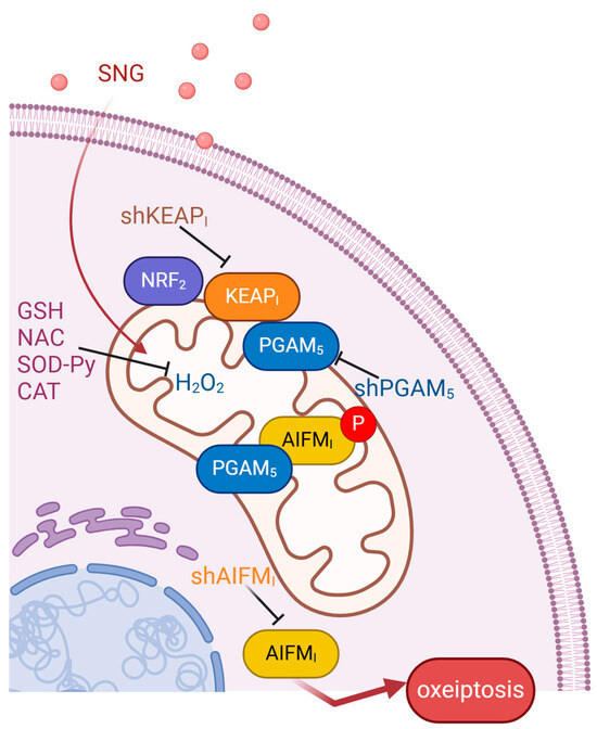 Schematic diagram of how SNG induces oxeiptosis in colorectal cancer cells based on [20]. SNG causes ROS accumulation in cancer cells, leading to activation of the KEAP1–PGAM5–AIFM1 signaling pathway. KEAP1 detects ROS and dissociates from NRF2, facilitating PGAM5 translocation to the mitochondria. There, PGAM5 dephosphorylates AIFM1, which causes chromatin condensation and DNA fragmentation, and mitochondrial dysfunction, hallmarks of the oxeiptosis phenotype. Oxeiptosis is characterized by ROS-induced regulated cell death with minimal inflammation, distinguishing it from other forms of regulated necrosis. SNG—sanguinarine, NRF2—nuclear factor erythroid-derived 2-like, KEAP1—Kelch-like Ech-associated protein 1, PGAM5—phosphoglycerate mutase family member 5, AIFM1—apoptosis-inducing factor mitochondrion-associated 1, GSH—glutathione, NAC—N-acetyl-cysteine, Sod-Py—sodium pyruvate, Cat—catalase.