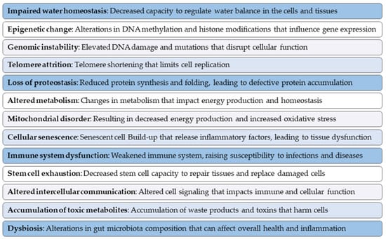 In summary, the proposed expansion of the hallmarks of aging provides a more comprehensive understanding of aging. These advancements could offer deeper insights into the mechanisms of aging, opening up new possibilities for interventions and prevention. Listed below are the hallmarks of aging, along with a summary highlighting the key aspects of the discussed topic.