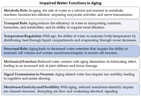 By proposing impaired water homeostasis as a hallmark of aging, we highlight the critical role that maintaining proper hydration plays in preventing or mitigating the physiological decline associated with aging, especially in tissues that are highly dependent on water balance, such as muscles, neurons, and the cardiovascular system. This imbalance could influence overall health and contribute to chronic inflammation [39,40], potentially also negatively affecting the other hallmarks.