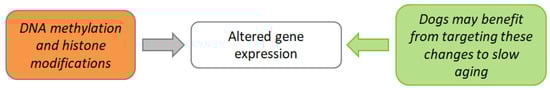 Epigenetic changes that directly contribute to aging and age-related diseases include DNA methylation and histone modifications [72], alterations in chromatin accessibility [73], loss of histones and heterochromatin [74], aberrant histone modifications, and deregulated expression or activity of microRNAs (miRNAs) [75]. Recent studies have shown that, as in humans, aging in dogs is marked by distinct epigenetic changes [76,77].