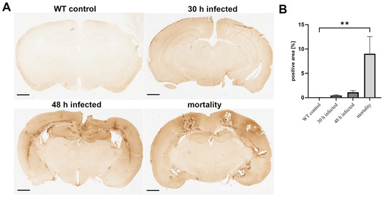 Figure 1. Increased fibrinogen infiltration during the course of pneumococcal meningitis. Wild-type (WT) mice were infected by administering 104 colony-forming units (CFU) of Streptococcus pneumoniae D39 type 2 strain into the subarachnoid space. At 30 and 48 h post-infection, and in the mortality group, the fibrinogen-positive area was visualized using an antibody. (A) The images show representative results. Scale bar: 800 µm. (B) Quantification of the fibrinogen-positive area [%] (WT control, n = 5; 30 h post-infection, n = 5; 48 h post-infection, n = 4; mortality group, n = 4). One-way ANOVA followed by Bonferroni test (**—p < 0.01).