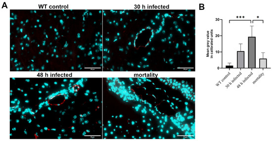Figure 2. Changes in PECAM-1 immunofluorescence during the course of pneumococcal meningitis. Wild-type (WT) mice were infected by administering 104 colony-forming units (CFU) of Streptococcus pneumoniae D39 type 2 strain into the subarachnoid space. At 30 and 48 h post-infection, as well as in the mortality group, PECAM-1 immunofluorescence was visualized using an anti-PECAM-1 antibody and detected with an anti-rabbit anti-Cy3 secondary antibody (in red; cell nuclei in blue). (A) The images show representative results. Scale bar: 50 µm. (B) Quantification of the PECAM-1-positive area [%] (WT control, n = 5; 30 h post-infection, n = 5; 48 h post-infection, n = 4; mortality group, n = 4). One-way ANOVA followed by Bonferroni test (*—p < 0.05; ***—p < 0.001).